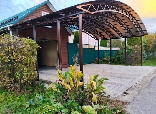 Арочный навес с поликарбонатом для стоянки авто в загородном доме Арт-672